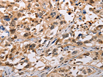 The image on the left is immunohistochemistry of paraffin-embedded Human esophagus cancer tissue using CSB-PA049233(ADAMDEC1 Antibody) at dilution 1/20, on the right is treated with fusion protein. (Original magnification: ×200)
