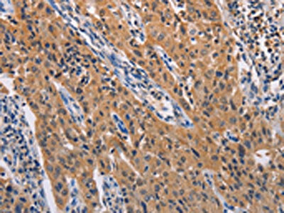 The image on the left is immunohistochemistry of paraffin-embedded Human liver cancer tissue using CSB-PA023292(ADAMDEC1 Antibody) at dilution 1/20, on the right is treated with fusion protein. (Original magnification: ×200)