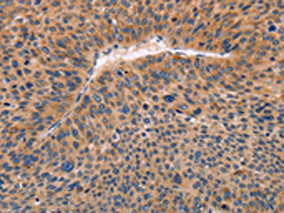 The image on the left is immunohistochemistry of paraffin-embedded Human lung cancer tissue using CSB-PA023292(ADAMDEC1 Antibody) at dilution 1/20, on the right is treated with fusion protein. (Original magnification: ×200)