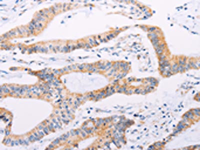 The image on the left is immunohistochemistry of paraffin-embedded Human colon cancer tissue using CSB-PA546061(ADAMTS16 Antibody) at dilution 1/50, on the right is treated with synthetic peptide. (Original magnification: ×200)