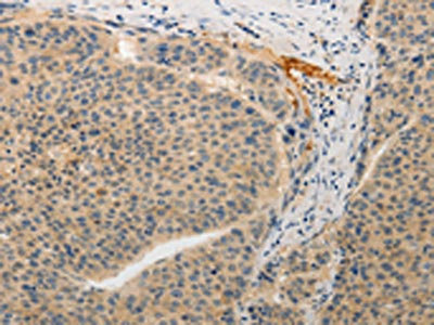 The image on the left is immunohistochemistry of paraffin-embedded Human gastic cancer tissue using CSB-PA657730(ADAMTS6 Antibody) at dilution 1/15, on the right is treated with synthetic peptide. (Original magnification: ×200)
