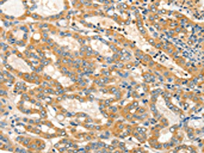 The image on the left is immunohistochemistry of paraffin-embedded Human thyroid cancer tissue using CSB-PA106602(ADCY3 Antibody) at dilution 1/30, on the right is treated with fusion protein. (Original magnification: ×200)