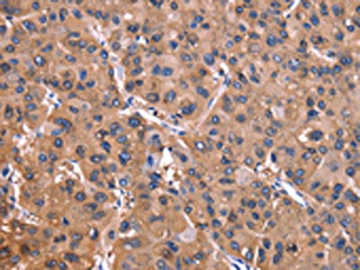 The image on the left is immunohistochemistry of paraffin-embedded Human liver cancer tissue using CSB-PA051887(ADM2 Antibody) at dilution 1/40, on the right is treated with synthetic peptide. (Original magnification: ×200)