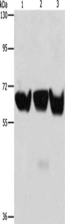 Gel: 8%SDS-PAGE, Lysate: 80 μg, Lane 1-3: 293T cells, PC3 cells, hela cells, Primary antibody: CSB-PA698673(ADRA1B Antibody) at dilution 1/500, Secondary antibody: Goat anti rabbit IgG at 1/8000 dilution, Exposure time: 2 minutes