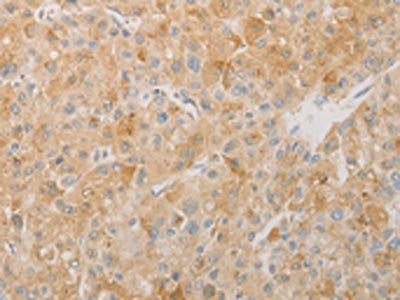 The image on the left is immunohistochemistry of paraffin-embedded Human liver cancer tissue using CSB-PA973928(AES Antibody) at dilution 1/20, on the right is treated with fusion protein. (Original magnification: ×200)