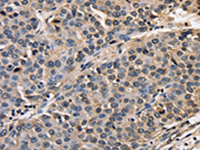 The image on the left is immunohistochemistry of paraffin-embedded Human liver cancer tissue using CSB-PA251527(AFP Antibody) at dilution 1/50, on the right is treated with fusion protein. (Original magnification: ×200)