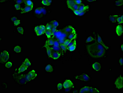 Immunofluorescence staining of MCF-7 cells with CSB-PA14209A0Rb at 1:200, counter-stained with DAPI. The cells were fixed in 4% formaldehyde, permeabilized using 0.2% Triton X-100 and blocked in 10% normal Goat Serum. The cells were then incubated with the antibody overnight at 4°C. The secondary antibody was Alexa Fluor 488-congugated AffiniPure Goat Anti-Rabbit IgG(H+L).