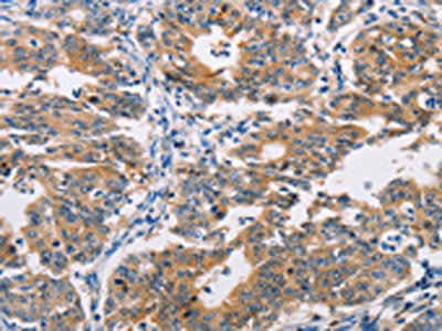 The image on the left is immunohistochemistry of paraffin-embedded Human gastic cancer tissue using CSB-PA445497(AGPAT4 Antibody) at dilution 1/25, on the right is treated with fusion protein. (Original magnification: ×200)