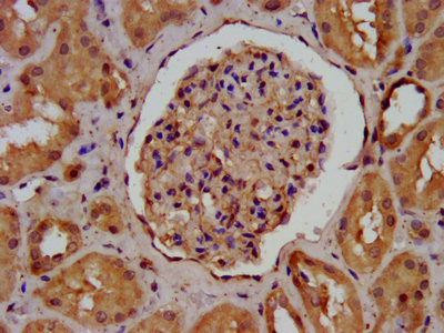 IHC image of CSB-PA001461LA01HU diluted at 1:400 and staining in paraffin-embedded human kidney tissue performed on a Leica BondTM system. After dewaxing and hydration, antigen retrieval was mediated by high pressure in a citrate buffer (pH 6.0). Section was blocked with 10% normal goat serum 30min at RT. Then primary antibody (1% BSA) was incubated at 4°C overnight. The primary is detected by a biotinylated secondary antibody and visualized using an HRP conjugated SP system.