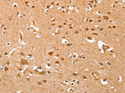 The image on the left is immunohistochemistry of paraffin-embedded Human brain tissue using CSB-PA241286(AHSG Antibody) at dilution 1/60, on the right is treated with fusion protein. (Original magnification: ×200)