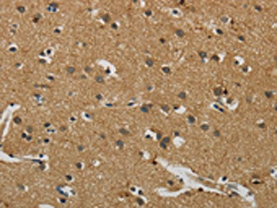 The image on the left is immunohistochemistry of paraffin-embedded Human brain tissue using CSB-PA970771(AIF1 Antibody) at dilution 1/50, on the right is treated with fusion protein. (Original magnification: ×200)