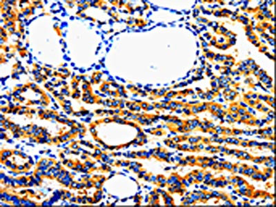 The image on the left is immunohistochemistry of paraffin-embedded Human thyroid cancer tissue using CSB-PA289421(AIMP2 Antibody) at dilution 1/50, on the right is treated with fusion protein. (Original magnification: ×200)