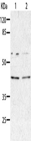 Gel: 8%SDS-PAGE, Lysate: 40 μg, Lane 1-2: HepG2 cells, A549 cells, Primary antibody: CSB-PA289421(AIMP2 Antibody) at dilution 1/350, Secondary antibody: Goat anti rabbit IgG at 1/8000 dilution, Exposure time: 1 minute