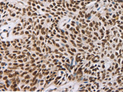 Gel: 10%SDS-PAGE, Lysate: 40 μg, Lane: Human liver cancer tissue, Primary antibody: CSB-PA943275(AKAP8 Antibody) at dilution 1/500, Secondary antibody: Goat anti rabbit IgG at 1/8000 dilution, Exposure time: 30 seconds