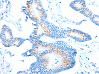 The image on the left is immunohistochemistry of paraffin-embedded Human colon cancer tissue using CSB-PA775649(AKT3 Antibody) at dilution 1/40, on the right is treated with synthetic peptide. (Original magnification: ×200)