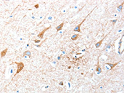 The image on the left is immunohistochemistry of paraffin-embedded Human brain tissue using CSB-PA775649(AKT3 Antibody) at dilution 1/40, on the right is treated with synthetic peptide. (Original magnification: ×200)