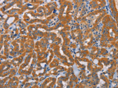 The image on the left is immunohistochemistry of paraffin-embedded Human thyroid cancer tissue using CSB-PA951869(ALDH3A1 Antibody) at dilution 1/30, on the right is treated with fusion protein. (Original magnification: ×200)