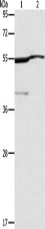 Gel: 10%SDS-PAGE, Lysate: 40 μg, Lane 1-2: A549 cells, mouse eye tissue, Primary antibody: CSB-PA951869(ALDH3A1 Antibody) at dilution 1/350, Secondary antibody: Goat anti rabbit IgG at 1/8000 dilution, Exposure time: 10 seconds