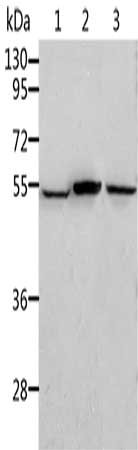 Gel: 10%SDS-PAGE, Lysate: 40 μg, Lane 1-3: Human normal kidney tissue, Human liver tissue, human liver cancer tissue, Primary antibody: CSB-PA254568(ALDH3B1 Antibody) at dilution 1/300, Secondary antibody: Goat anti rabbit IgG at 1/8000 dilution, Exposure time: 45 seconds