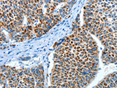 The image on the left is immunohistochemistry of paraffin-embedded Human breast cancer tissue using CSB-PA935612(ALDH4A1 Antibody) at dilution 1/45, on the right is treated with fusion protein. (Original magnification: ×200)