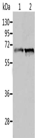 Gel: 10%SDS-PAGE, Lysate: 40 μg, Lane 1-2: Human fetal liver tissue, Human liver cancer tissue, Primary antibody: CSB-PA935612(ALDH4A1 Antibody) at dilution 1/450, Secondary antibody: Goat anti rabbit IgG at 1/8000 dilution, Exposure time: 30 seconds