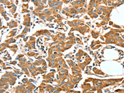 The image on the left is immunohistochemistry of paraffin-embedded Human breast cancer tissue using CSB-PA779355(ALDH9A1 Antibody) at dilution 1/50, on the right is treated with synthetic peptide. (Original magnification: ×200)