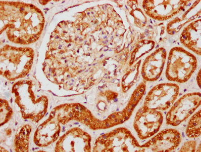 IHC image of CSB-PA001677ESR2HU diluted at 1:121 and staining in paraffin-embedded human kidney tissue performed on a Leica BondTM system. After dewaxing and hydration, antigen retrieval was mediated by high pressure in a citrate buffer (pH 6.0). Section was blocked with 10% normal goat serum 30min at RT. Then primary antibody (1% BSA) was incubated at 4°C overnight. The primary is detected by a biotinylated secondary antibody and visualized using an HRP conjugated SP system.