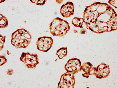 IHC image of CSB-PA001677ESR2HU diluted at 1:121 and staining in paraffin-embedded human placenta tissue performed on a Leica BondTM system. After dewaxing and hydration, antigen retrieval was mediated by high pressure in a citrate buffer (pH 6.0). Section was blocked with 10% normal goat serum 30min at RT. Then primary antibody (1% BSA) was incubated at 4°C overnight. The primary is detected by a biotinylated secondary antibody and visualized using an HRP conjugated SP system.