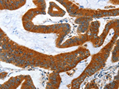 The image on the left is immunohistochemistry of paraffin-embedded Human colon cancer tissue using CSB-PA005512(ANAPC10 Antibody) at dilution 1/40, on the right is treated with fusion protein. (Original magnification: ×200)