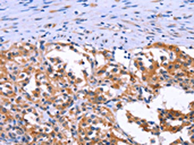 The image on the left is immunohistochemistry of paraffin-embedded Human thyroid cancer tissue using CSB-PA110575(ANO1 Antibody) at dilution 1/40, on the right is treated with synthetic peptide. (Original magnification: ×200)