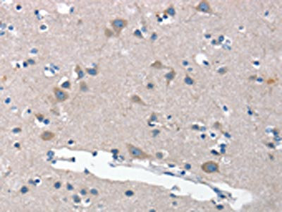 The image on the left is immunohistochemistry of paraffin-embedded Human brain tissue using CSB-PA285547(ANP32C Antibody) at dilution 1/30, on the right is treated with synthetic peptide. (Original magnification: ×200)