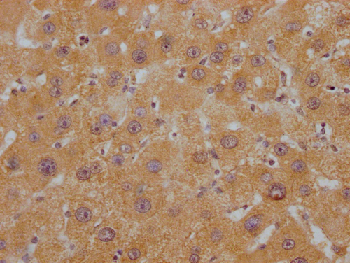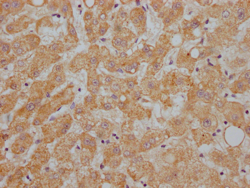 IHC image of CSB-PA001930NA01HU diluted at 1:200 and staining in paraffin-embedded human liver tissue performed on a Leica BondTM system. After dewaxing and hydration, antigen retrieval was mediated by high pressure in a citrate buffer (pH 6.0). Section was blocked with 10% normal goat serum 30min at RT. Then primary antibody (1% BSA) was incubated at 4°C overnight. The primary is detected by a Goat anti-rabbit IgG labeled by HRP and visualized using 0.05% DAB.