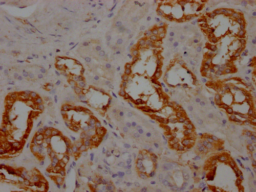 IHC image of CSB-PA001947LA01HU diluted at 1:100 and staining in paraffin-embedded human kidney tissue performed on a Leica BondTM system. After dewaxing and hydration, antigen retrieval was mediated by high pressure in a citrate buffer (pH 6.0). Section was blocked with 10% normal goat serum 30min at RT. Then primary antibody (1% BSA) was incubated at 4°C overnight. The primary is detected by a Goat anti-rabbit IgG labeled by HRP and visualized using 0.05% DAB.