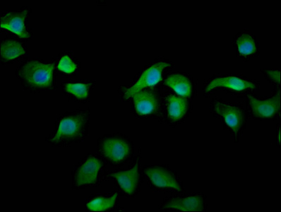 Immunofluorescence staining of A549 cells with CSB-PA681513LA01HU at 1:200, counter-stained with DAPI. The cells were fixed in 4% formaldehyde, permeabilized using 0.2% Triton X-100 and blocked in 10% normal Goat Serum. The cells were then incubated with the antibody overnight at 4°C. The secondary antibody was Alexa Fluor 488-congugated AffiniPure Goat Anti-Rabbit IgG(H+L).