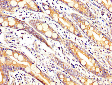 IHC image of CSB-PA850791LA01HU diluted at 1:200 and staining in paraffin-embedded human small intestine tissue performed on a Leica BondTM system. After dewaxing and hydration, antigen retrieval was mediated by high pressure in a citrate buffer (pH 6.0). Section was blocked with 10% normal goat serum 30min at RT. Then primary antibody (1% BSA) was incubated at 4°C overnight. The primary is detected by a biotinylated secondary antibody and visualized using an HRP conjugated SP system.