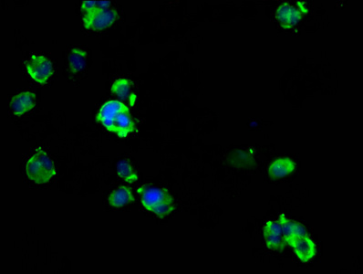 Immunofluorescence staining of MCF-7 cells with CSB-PA850807LA01HU at 1:133, counter-stained with DAPI. The cells were fixed in 4% formaldehyde, permeabilized using 0.2% Triton X-100 and blocked in 10% normal Goat Serum. The cells were then incubated with the antibody overnight at 4°C. The secondary antibody was Alexa Fluor 488-congugated AffiniPure Goat Anti-Rabbit IgG(H+L).