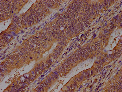 IHC image of CSB-PA002155LA01HU diluted at 1:400 and staining in paraffin-embedded human colon cancer performed on a Leica BondTM system. After dewaxing and hydration, antigen retrieval was mediated by high pressure in a citrate buffer (pH 6.0). Section was blocked with 10% normal goat serum 30min at RT. Then primary antibody (1% BSA) was incubated at 4°C overnight. The primary is detected by a biotinylated secondary antibody and visualized using an HRP conjugated SP system.