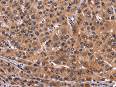 The image on the left is immunohistochemistry of paraffin-embedded Human liver cancer tissue using CSB-PA219850(ART5 Antibody) at dilution 1/50, on the right is treated with fusion protein. (Original magnification: ×200)