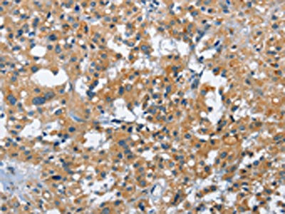 The image on the left is immunohistochemistry of paraffin-embedded Human thyroid cancer tissue using CSB-PA038092(ATF4 Antibody) at dilution 1/40, on the right is treated with fusion protein. (Original magnification: ×200)
