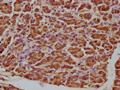 IHC image of CSB-PA002276LA01HU diluted at 1:100 and staining in paraffin-embedded human pancreatic tissue performed on a Leica BondTM system. After dewaxing and hydration, antigen retrieval was mediated by high pressure in a citrate buffer (pH 6.0). Section was blocked with 10% normal goat serum 30min at RT. Then primary antibody (1% BSA) was incubated at 4°C overnight. The primary is detected by a biotinylated secondary antibody and visualized using an HRP conjugated SP system.