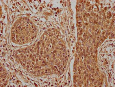 IHC image of CSB-PA002276LA01HU diluted at 1:100 and staining in paraffin-embedded human cervical cancer performed on a Leica BondTM system. After dewaxing and hydration, antigen retrieval was mediated by high pressure in a citrate buffer (pH 6.0). Section was blocked with 10% normal goat serum 30min at RT. Then primary antibody (1% BSA) was incubated at 4°C overnight. The primary is detected by a biotinylated secondary antibody and visualized using an HRP conjugated SP system.