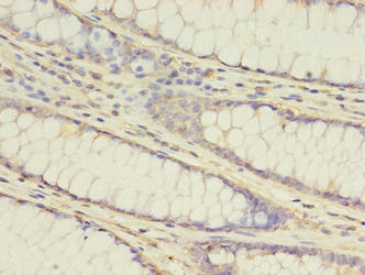 Immunohistochemistry of paraffin-embedded human colon cancer using CSB-PA734569LA01HU at dilution of 1:100