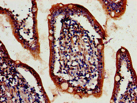 IHC image of CSB-PA774797LA01HU diluted at 1:700 and staining in paraffin-embedded human small intestine tissue performed on a Leica BondTM system. After dewaxing and hydration, antigen retrieval was mediated by high pressure in a citrate buffer (pH 6.0). Section was blocked with 10% normal goat serum 30min at RT. Then primary antibody (1% BSA) was incubated at 4°C overnight. The primary is detected by a biotinylated secondary antibody and visualized using an HRP conjugated SP system.