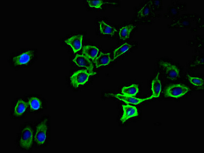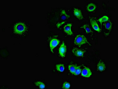 Immunofluorescent analysis of A549 cells using CSB-PA18129A0Rb at dilution of 1:100 and Alexa Fluor 488-congugated AffiniPure Goat Anti-Rabbit IgG(H+L)