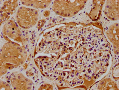IHC image of CSB-PA818735LA01HU diluted at 1:500 and staining in paraffin-embedded human kidney tissue performed on a Leica BondTM system. After dewaxing and hydration, antigen retrieval was mediated by high pressure in a citrate buffer (pH 6.0). Section was blocked with 10% normal goat serum 30min at RT. Then primary antibody (1% BSA) was incubated at 4°C overnight. The primary is detected by a biotinylated secondary antibody and visualized using an HRP conjugated SP system.