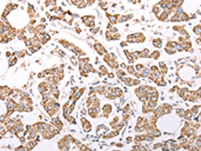 The image on the left is immunohistochemistry of paraffin-embedded Human breast cancer tissue using CSB-PA033338(ATPIF1 Antibody) at dilution 1/60, on the right is treated with fusion protein. (Original magnification: ×200)