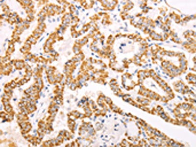 The image on the left is immunohistochemistry of paraffin-embedded Human thyroid cancer tissue using CSB-PA033338(ATPIF1 Antibody) at dilution 1/60, on the right is treated with fusion protein. (Original magnification: ×200)