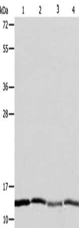 Gel: 10+12+15%SDS-PAGE, Lysate: 40 μg, Lane 1-4: Hela cells, Jurkat cells, MCF7 cells, A431 cells, Primary antibody: CSB-PA033338(ATPIF1 Antibody) at dilution 1/1350, Secondary antibody: Goat anti rabbit IgG at 1/8000 dilution, Exposure time: 1 minute