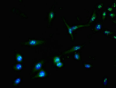 Immunofluorescent analysis of Hela cells using CSB-PA002460LA01HU at dilution of 1:100 and Alexa Fluor 488-congugated AffiniPure Goat Anti-Rabbit IgG(H+L)