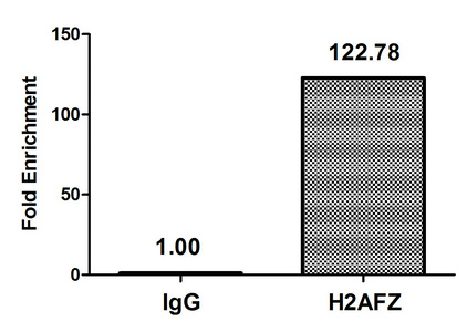 Chromatin Immunoprecipitation Hela (4*106, treated with 30mM sodium butyrate for 4h) were treated with Micrococcal Nuclease, sonicated, and immunoprecipitated with 5µg anti-H2AFZ (CSB-PA010100OA07acHU) or a control normal rabbit IgG. The resulting ChIP DNA was quantified using real-time PCR with primers against the β-Globin promoter.